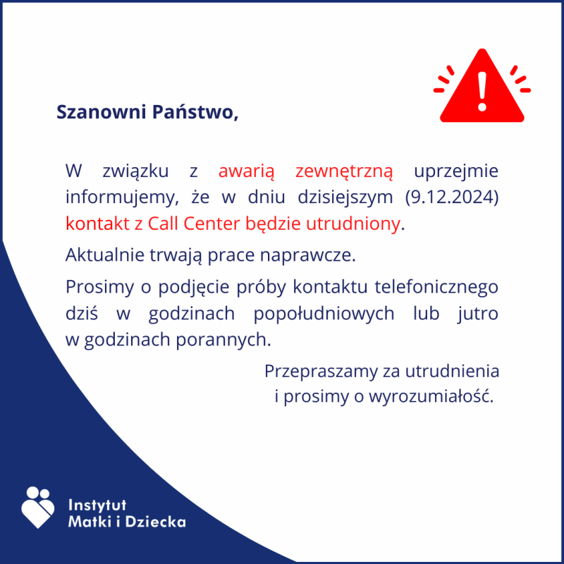 W związku z awarią zewnętrzną uprzejmie informujemy, że w dniu dzisiejszym (9.12.2024) kontakt z Call Center będzie utrudniony.