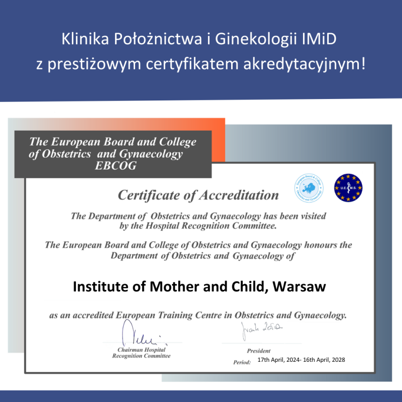 Z dumą informujemy, że Klinika Położnictwa i Ginekologii Instytutu Matki i Dziecka, prowadzona przez prof. Tadeusza Issata, kierownika Kliniki, otrzymała Certyfikat Akredytacyjny przyznawany przez EBCOG - European Board&College of Obstetrics and Gynaecology! Wyróżnienie jest jednoznaczne z potwierdzeniem najwyższych europejskich standardów kształcenia rezydentów w położnictwie i ginekologii.